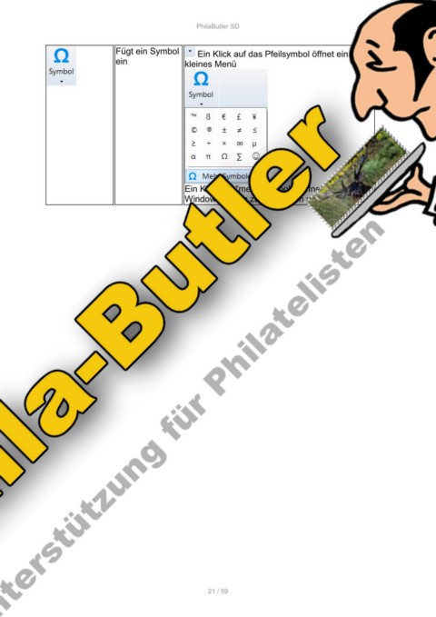 PhilaButler SD Fügt ein Symbol Ein Klick auf das Pfeilsymbol öffnet ein ein kleines Menü Ein Klick auf "mehr Symbole" öffnet den Windows Dialog zum Einfügen von Symbolen. 21 / 59