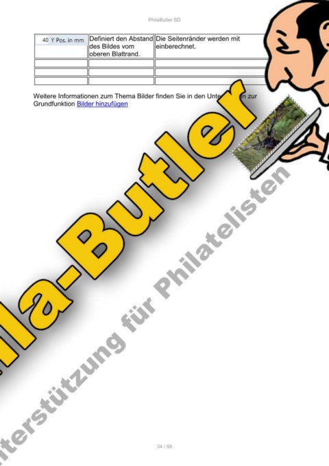 PhilaButler SD Definiert den Abstand Die Seitenränder werden mit des Bildes vom einberechnet. oberen Blattrand. Weitere Informationen zum Thema Bilder finden Sie in den Unterkapiteln zur Grundfunktion Bilder hinzufügen 34 / 59